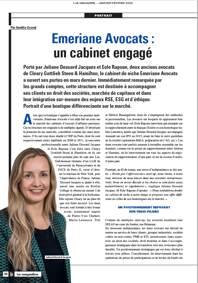 Juliane Dessard Jacques et Eole Rapone ont été interviewés par Aurélia Granel pour la LJA (le Magazine). L’occasion d’évoquer le positionnement d’Emeriane Avocats, au service de la création de valeur responsable et de l’impact.