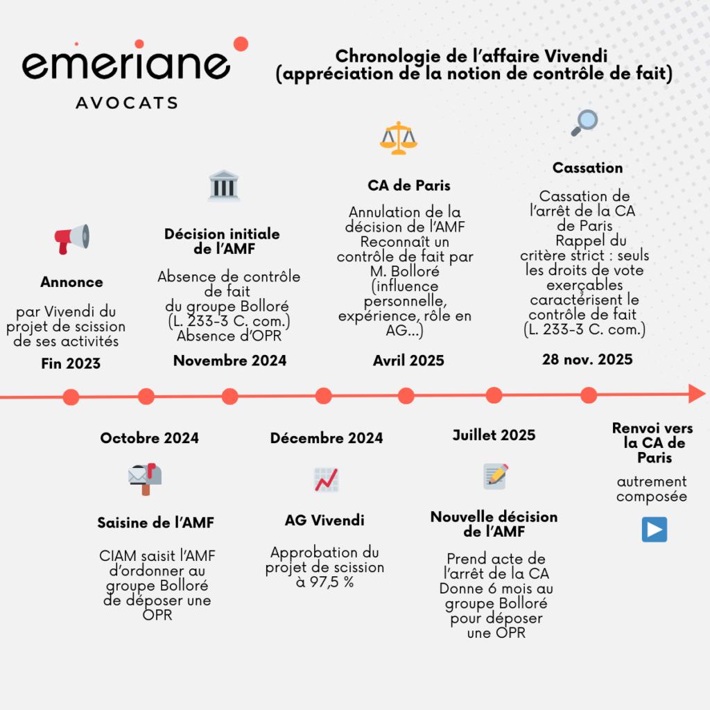 - 28 novembre 2025 : la Cour de cassation casse l’arrêt du 22 avril 2025 de la CA et renvoi devant la CA de Paris composée autrement pour se prononcer, à nouveau, sur l’exercice ou non d’un contrôle de fait de Vivendi par M. Bolloré au sens de l’article L. 233-3 du Code de commerce