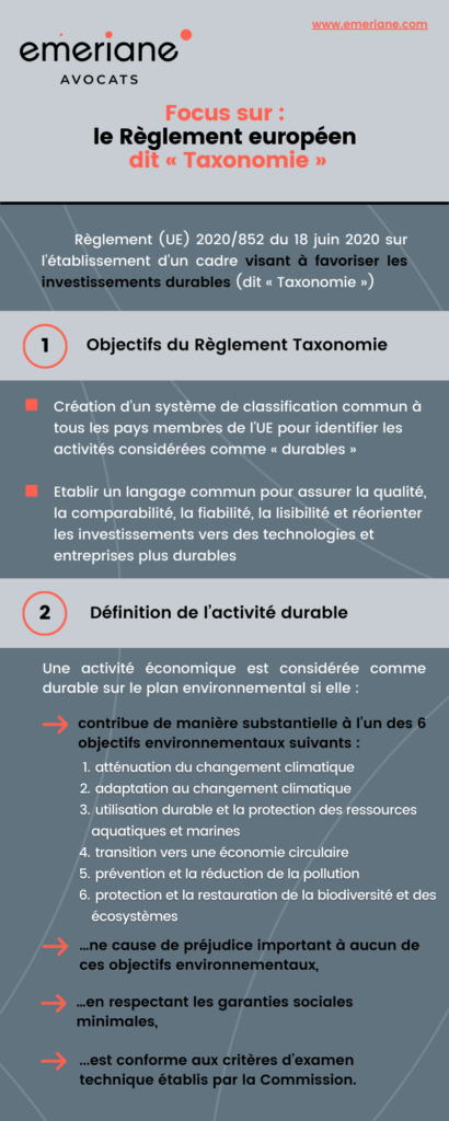 Le Règlement Taxonomie du 18 juin 2020 est la pierre angulaire du Green deal européen initié par la Commission européenne. Ce Règlement prévoit un système de classification commun à l’UE permettant d’identifier les activités économiques considérées comme durables.