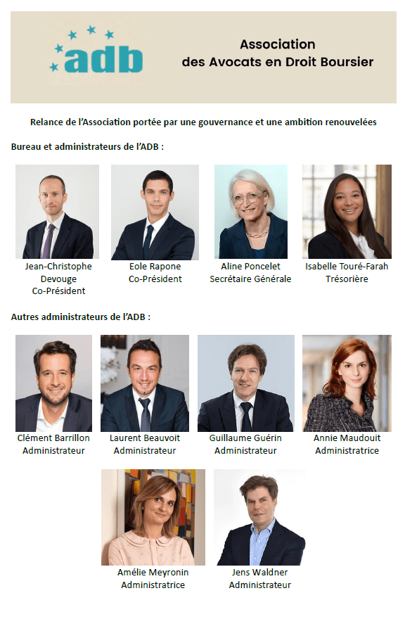 Créée en 2011 sous l’impulsion d’Euronext et de l’Autorité des marchés financiers (AMF) – France, l’ADB est une association d’avocats rassemblant les professionnels du droit boursier.